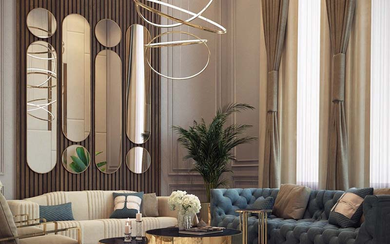 Những chiếc gương nghệ thuật rất phù hợp trong trang trí tường phòng khách. Vật phẩm này không chỉ giúp ngôi nhà trông rộng rãi và thoáng đãng hơn mà còn tạo nên vẻ đẹp sang trọng cho tổng thể ngôi nhà.